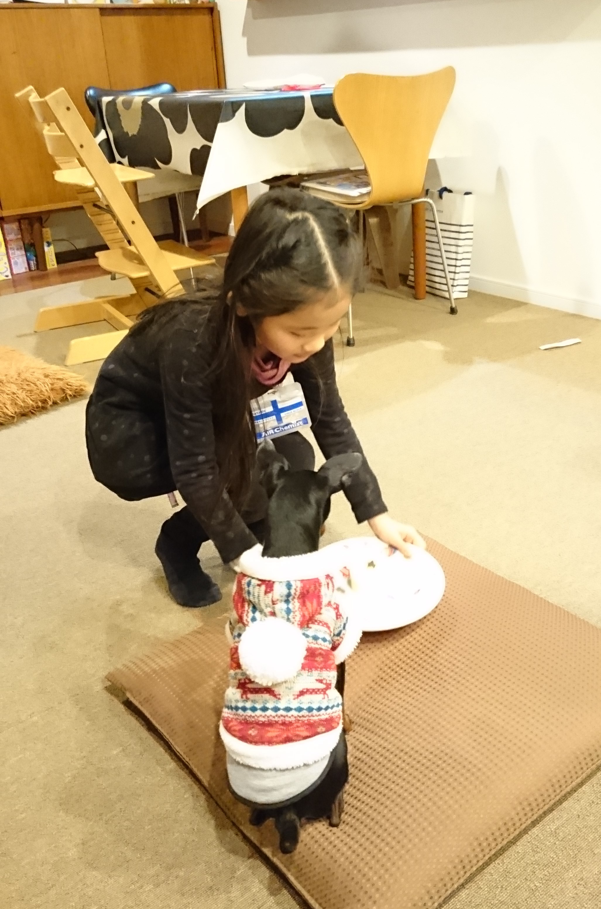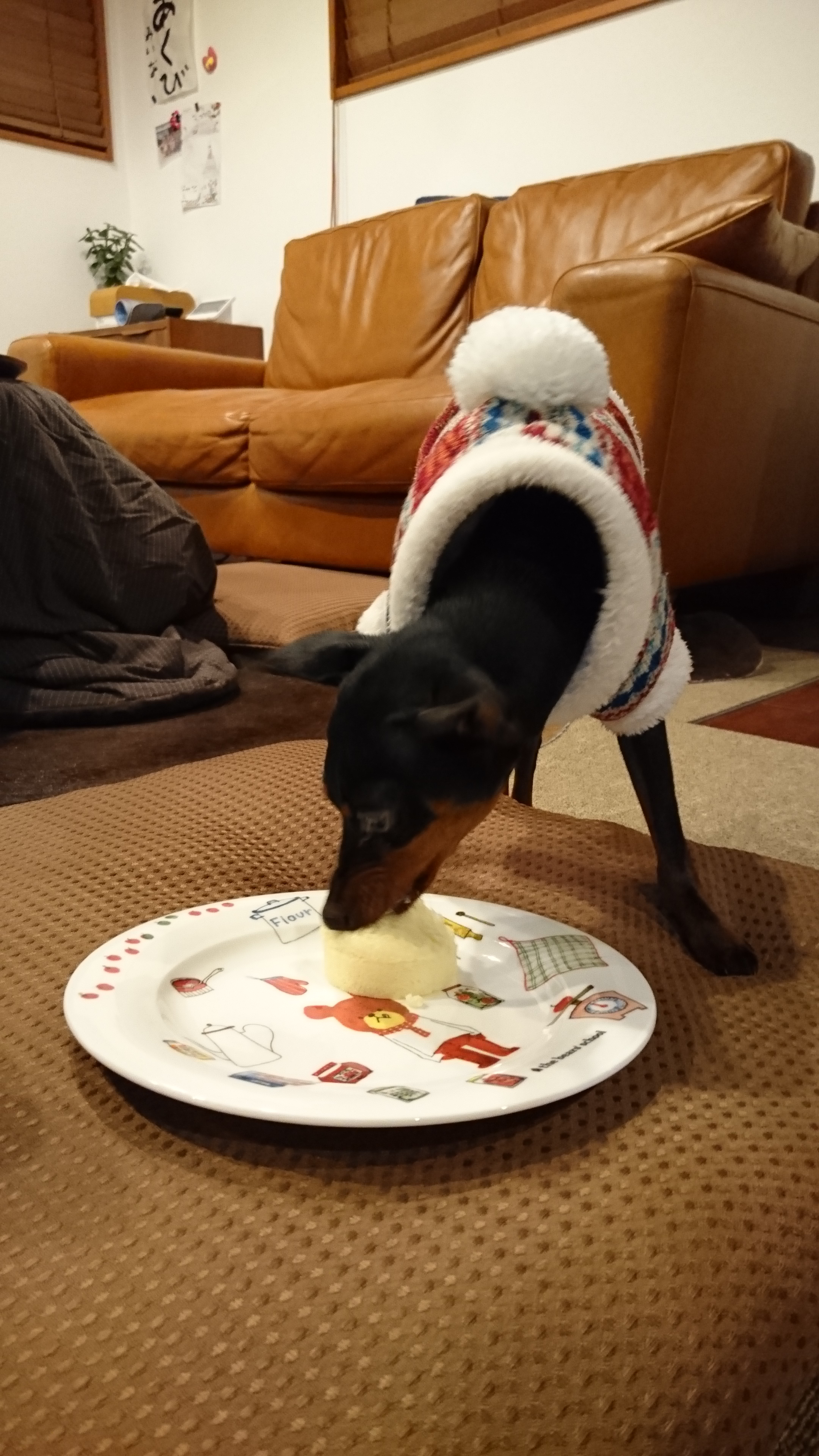 「アトム」は足の関節が外れてしまう先天性の持病を持っています。雰囲気がガラっとダサくなってしまいますが、無垢材の上に安いカーペットを敷きつめました。