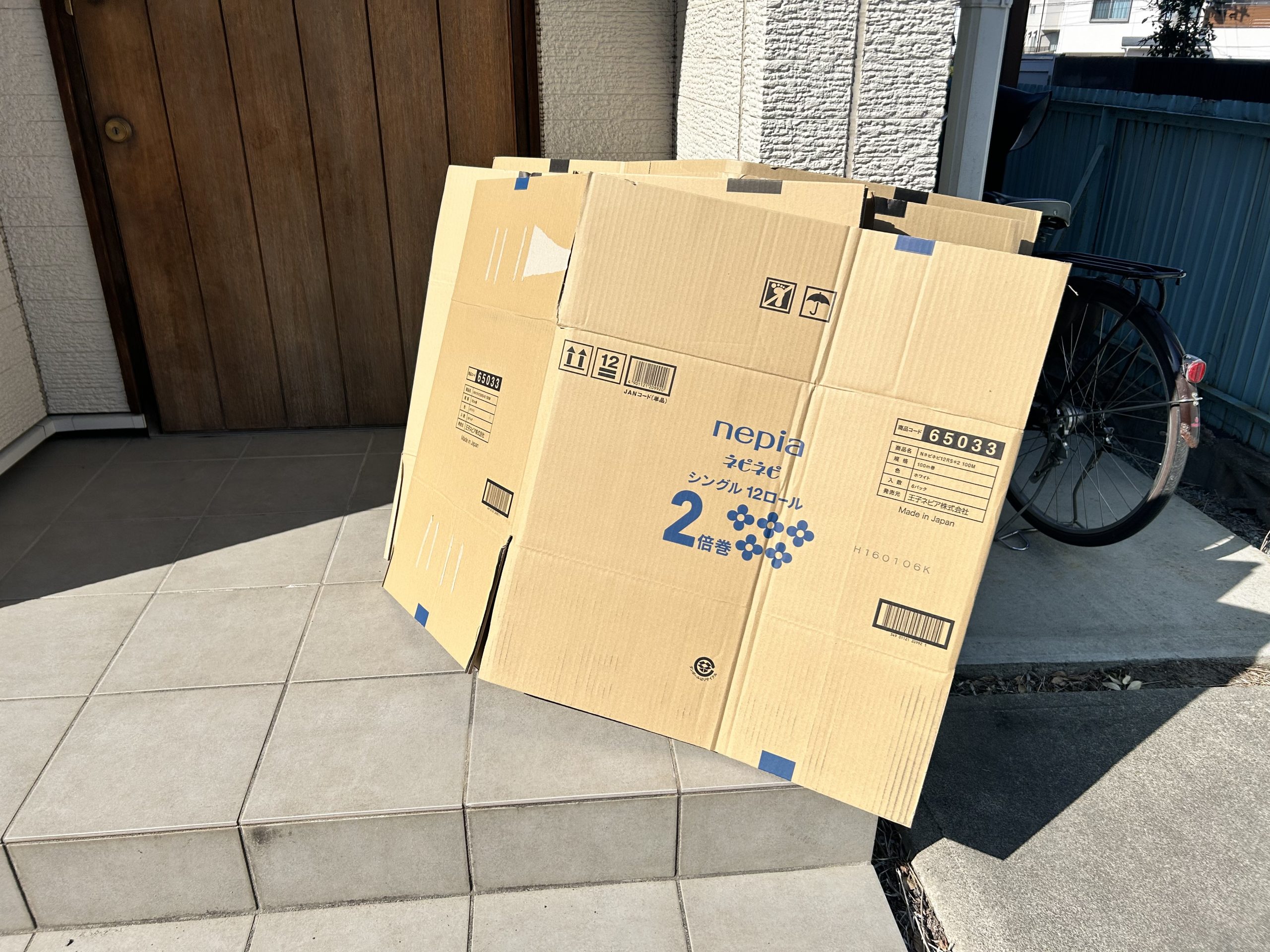 段ボールをかき集める父親。